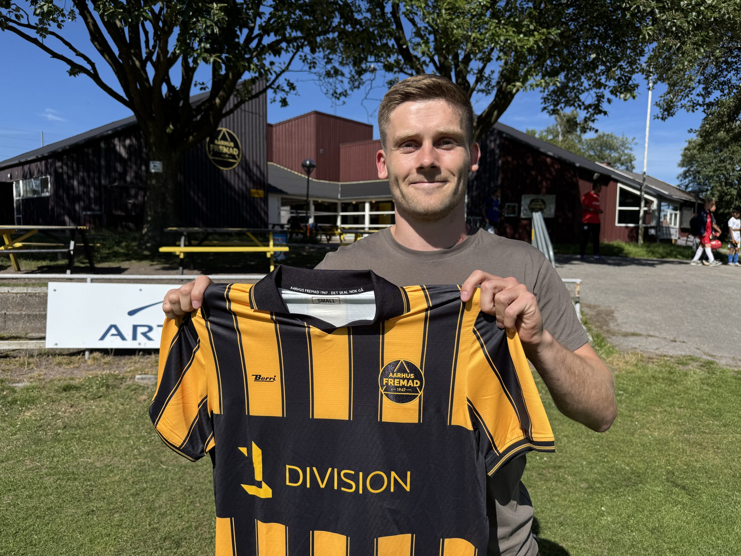 – Jeg kommer altid med en benhård arbejdsindsats. Og så kommer jeg til at bidrage på den sidste tredjedel af banen, hvor jeg skal bidrage med nogle mål og nogle assists. Jeg tør ‘sige noget’, og jeg sørger for at alle folk altid er oppe på tæerne. Jeg giver altid 100 procent, og solen skinner altid på Vangen, som den også gør i dag, lyder det fra den nye 9’er i Aarhus Fremad.